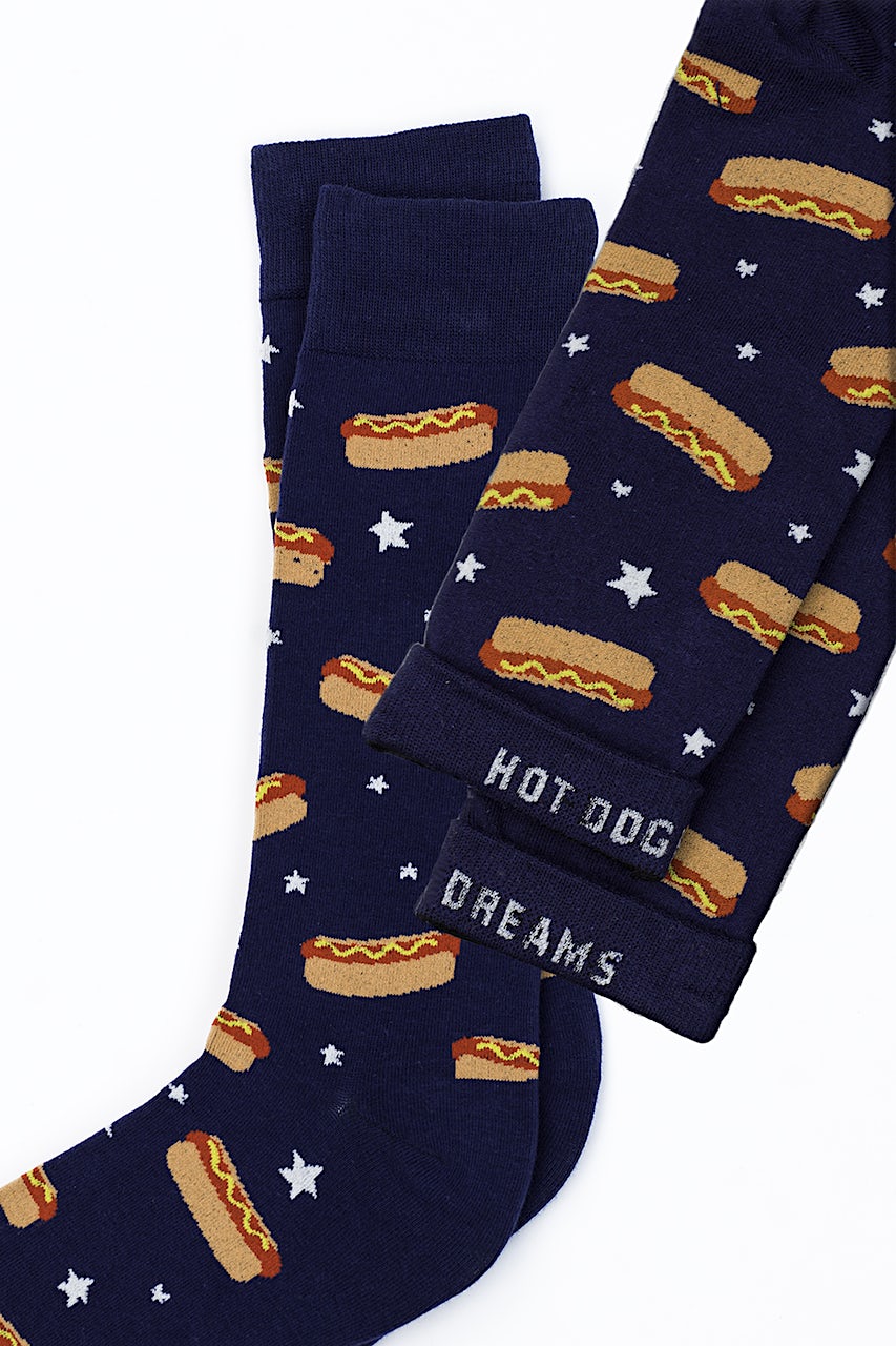 We dream of hot dogs sometimes, too — you're not the only one. These conversational socks feature glorious hot dogs set atop a starry navy blue background. Made of a high quality cotton blend, these hot dog socks will keep you comfortable, stylish, and perhaps even a little hungry, too.