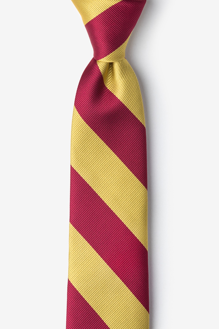 Every distinguished young gentleman should own a classic collegiate stripe tie. Its ease of pairing with dress shirts and suits alike has made this design a timeless favorite over the years and a must-have for school and business uniforms. Each boy's tie is made of 100% woven microfiber for a sturdy tie that is sure to outlast the seasons and make for easy maintenance. Featured in burgundy and gold stripes, we invite you to fall in love with this classic.