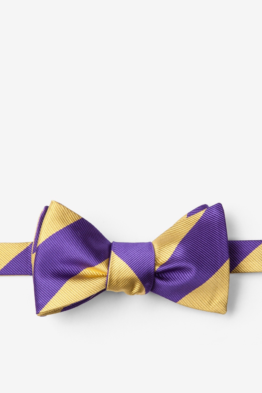 Every distinguished gentleman should own a classic collegiate stripe tie. It's ease of pairing with dress shirts and suits alike has made this design a timeless favorite over the years and a must have for school and business uniforms. Each self tie bow tie is designed with 100% woven microfibers for a sturdy tie that is sure to outlast the seasons and make for easy maintenance. Featured in purple and gold stripe, we invite you to fall in love with this classic.