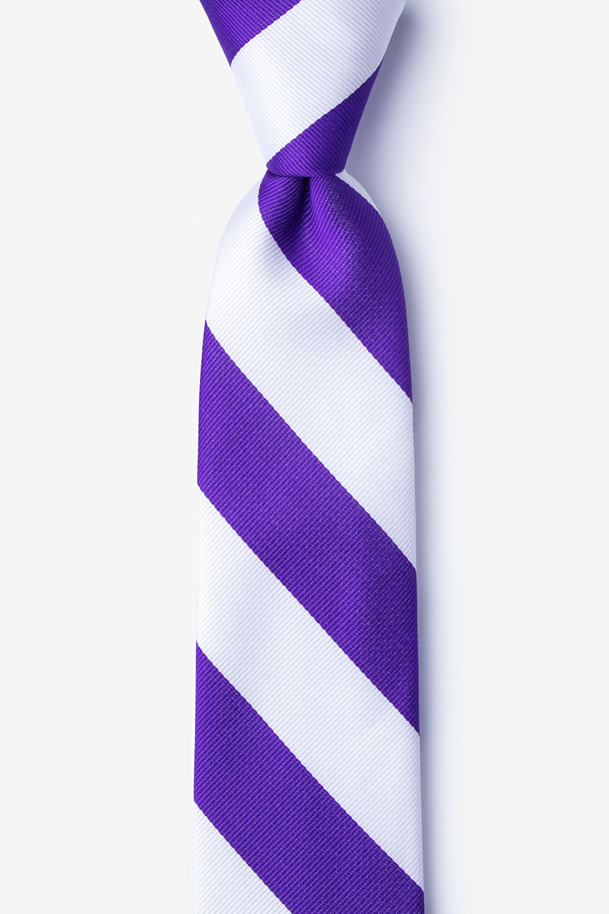 Every distinguished young gentleman should own a classic collegiate stripe tie. Its ease of pairing with dress shirts and suits alike has made this design a timeless favorite over the years and a must-have for school and business uniforms. Each boy's tie is made of 100% woven microfiber for a sturdy tie that is sure to outlast the seasons and make for easy maintenance. Featured in purple and white stripes, we invite you to fall in love with this classic.
