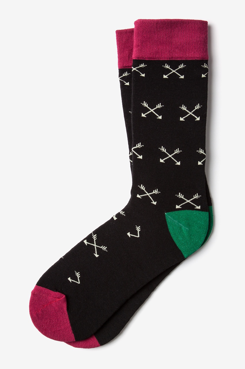 Hit the mark the the Arrows Crossed Socks from Sock Genius. Featuring a repeating pattern of white crossed arrows on a solid black background, a berry red cuff and toe, and a green heel turn, these socks make a uniquely creative statement. Made of soft, high quality cotton, these moisture wicking socks will give your look a playfully graphic touch.