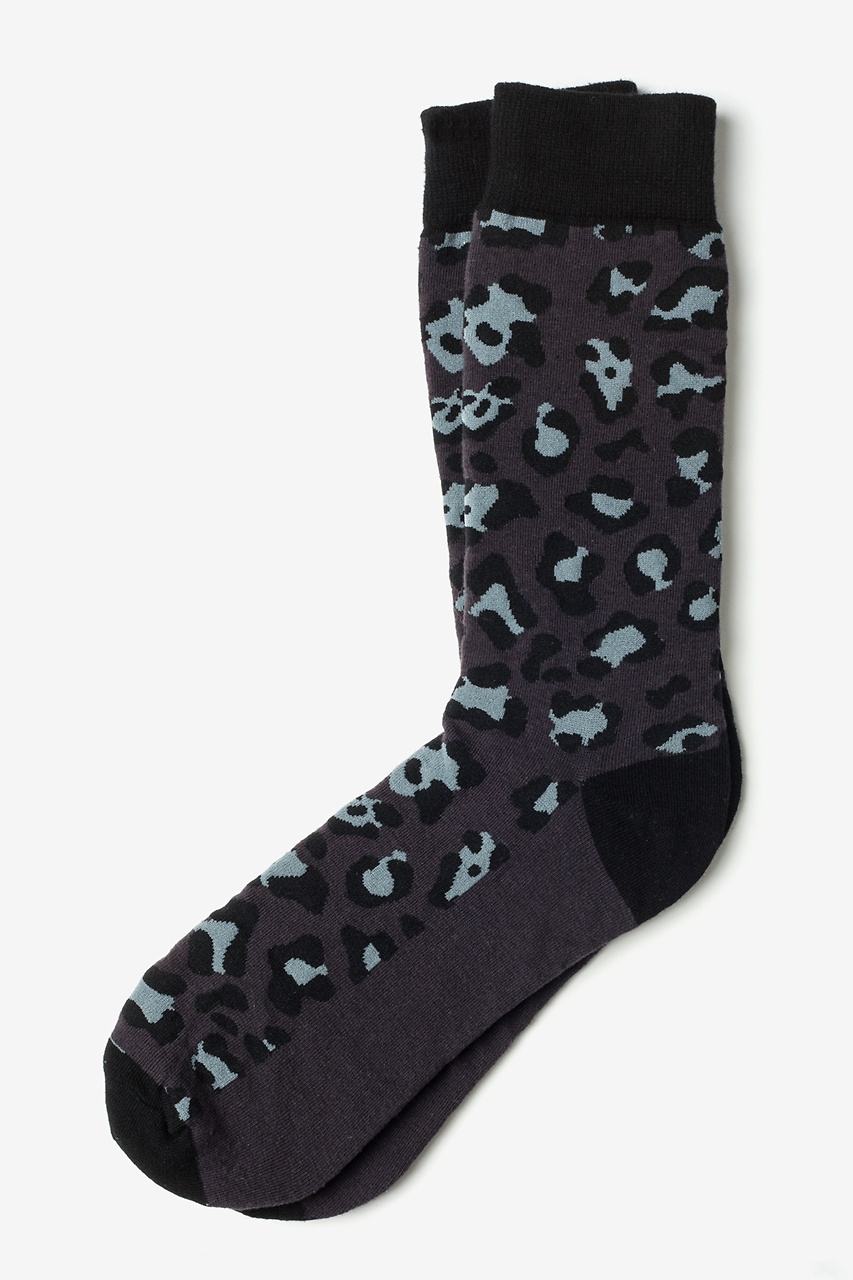 Show off your wild side by adding a touch of animal print to your everyday ensemble. Our Leopard Print Socks feature gray and black leopard spots on a charcoal background with black cuffs and heel turns. Made of high quality cotton, these socks are as comfortable as they are stylish.