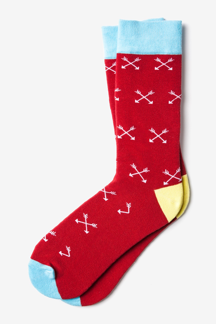 Hit the mark the the Arrows Crossed Socks from Sock Genius. Featuring a repeating pattern of white crossed arrows on a solid red background, a sky blue red cuff and toe, and a yellow heel turn, these socks make a uniquely creative statement. Made of soft, high quality cotton, these moisture wicking socks will give your look a playfully graphic touch.