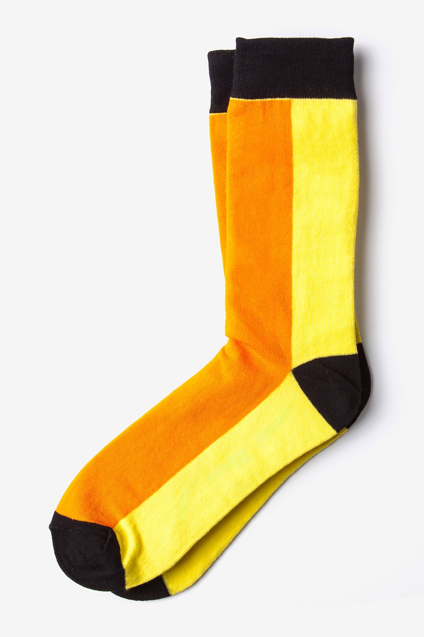 Turn your stripes on their side with the Fullerton Split Socks from Sock Genius. These ingenious dress socks will give a lasting impression with a orange stripe in the front of the leg and yellow on the back side of the leg and sole, all accented by a black cuff, heel turn, and toe. Made from high quality cotton, these moisture wicking socks will give your soles a party in the front and the back.