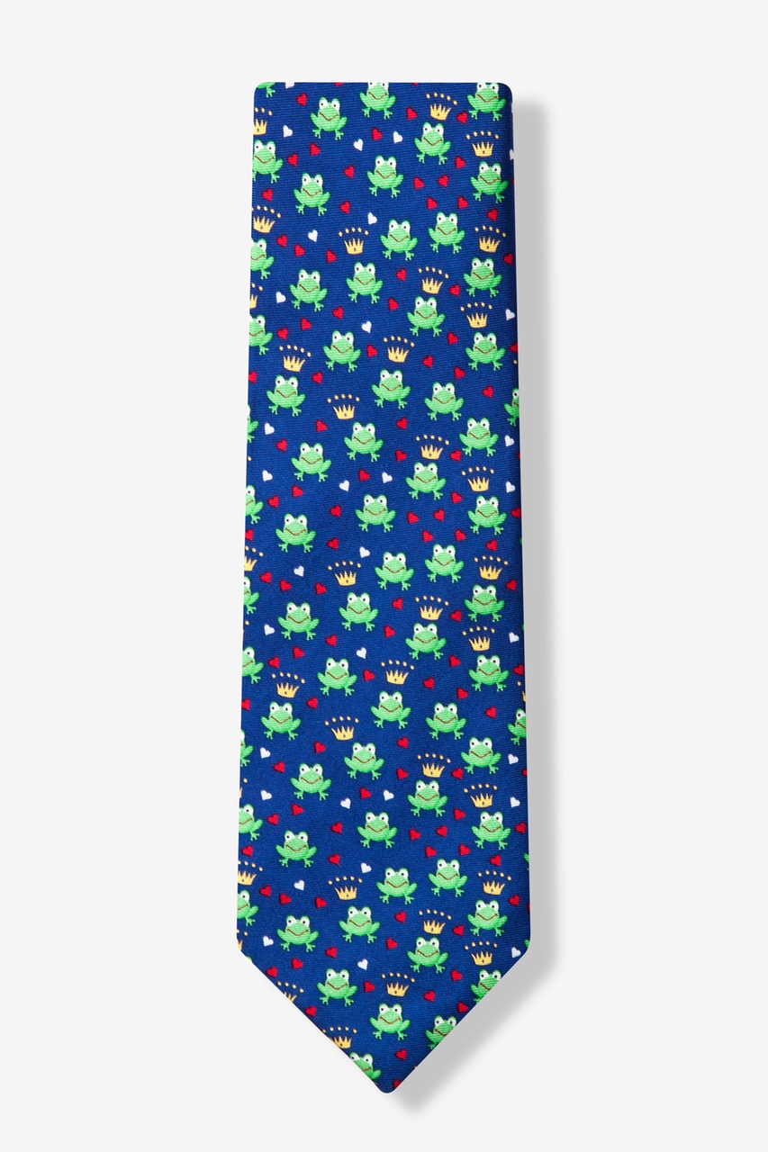 Transform into a handsome prince with this charming necktie from Alynn Neckwear. This 100% silk tie features charming green frogs adorned in a yellow crowns and red hearts atop a navy blue background. Win over your princess's heart and whisk her away in a fairy tale with this one of a kind tie.