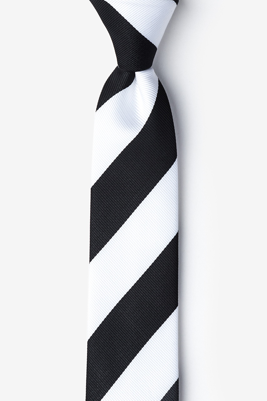 Every distinguished gentleman should own a classic collegiate stripe tie. It's ease of pairing with dress shirts and suits alike has made this design a timeless favorite over the years and a must have for school and business uniforms. Each skinny tie is designed with 100% woven microfibers for a sturdy tie that is sure to outlast the seasons and make for easy maintenance. Featured in black and white stripe, we invite you to fall in love with this classic.