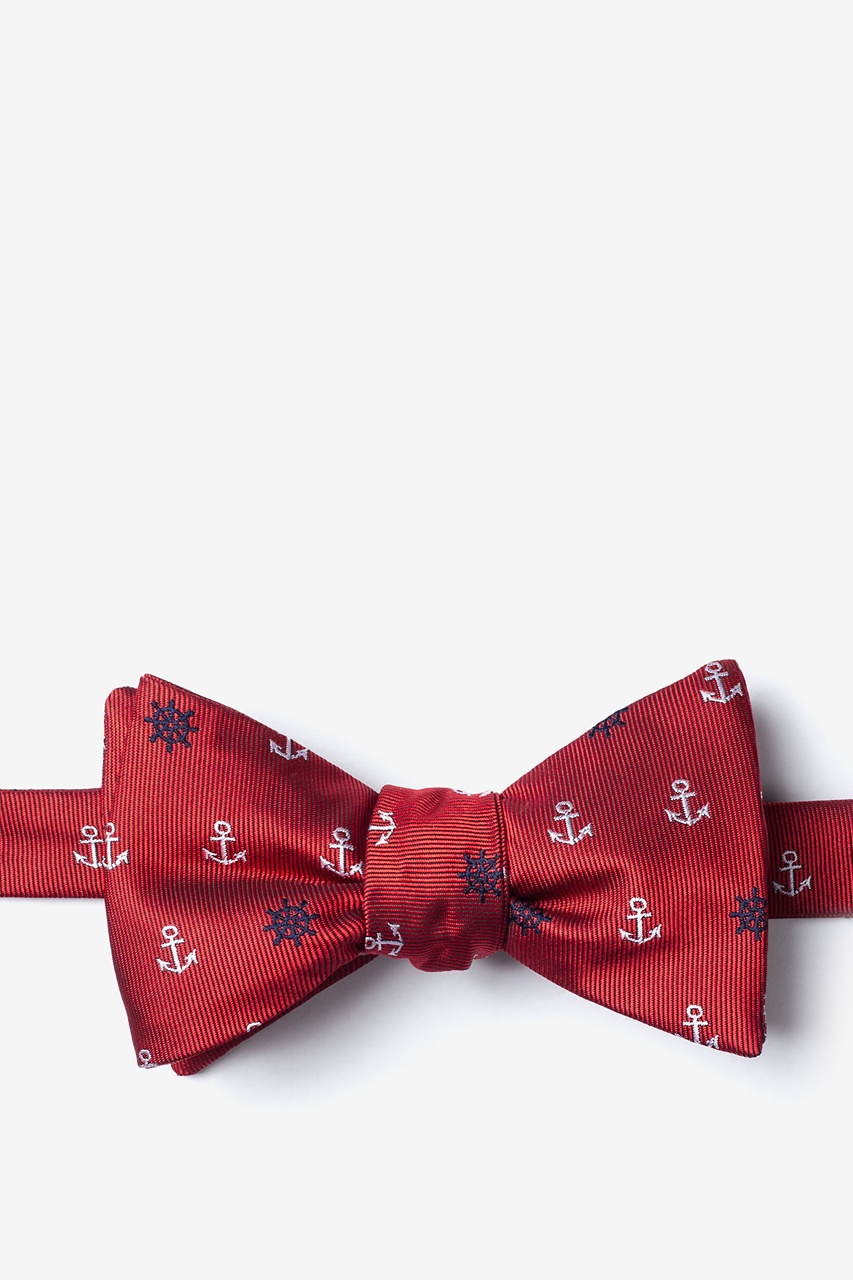 Anchors away! Our Anchors & Ship Wheels Butterfly Bow Tie features a pattern of white anchors and navy blue steering wheels atop a red background. Happy sailing!