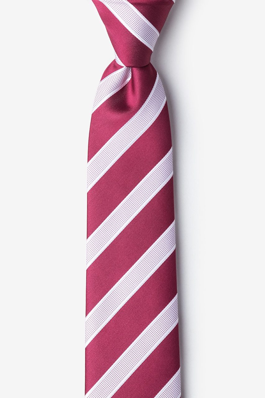 Welcome the season with a new skinny necktie! Designed by Silk Rhino Neckwear, the Jefferson Stripe men's skinny necktie in maroon is a great addition to any wardrobe. Alternating stripes combine a subtle textured white and pink stitched stripe and a satin like maroon stripe that is soft to the touch. With a microfiber woven construction, this skinny necktie is sure to last. After all, with a necktie from Silk Rhino Neckwear, you know it will be soft as silk, tough as a rhino!
