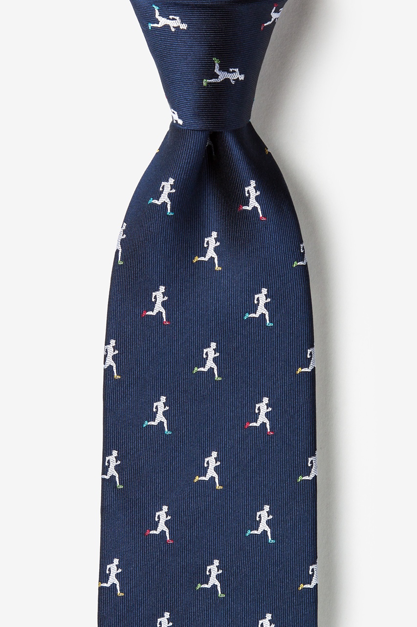 This tie will be running through your mind all day! Our Runner's High Silk Tie in navy blue features a myriad of sprinting silhouettes contrasted against a navy background. Each runner is detailed with differently colored shoes, producing a visually dynamic look. Remind yourself of that euphoric feeling after a good run with this necktie.