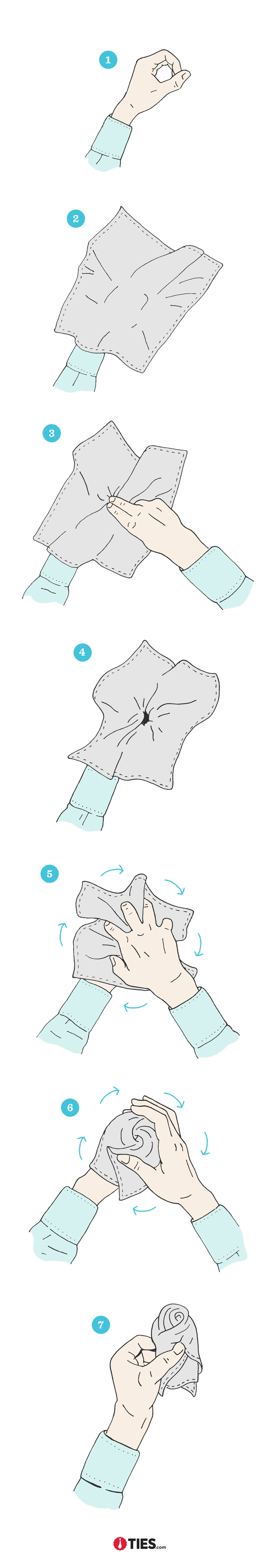 Although this fold may look simple at first glance, The Rose fold requires a bit of finesse and dexterity to execute it to perfection. When properly folded, the folds will spiral out from the center like a rosebud in bloom. Execution is key and subtle adjustments will go a long way. Satin silk pocket squares are highly recommended for this fold due to the luster and richness the curving folds create.