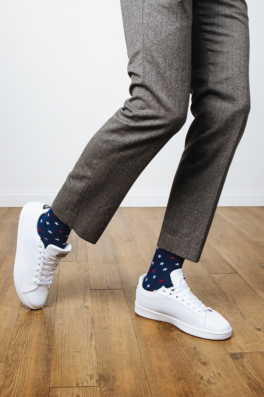 Feeling patriotic? Rock these Home of the Brave socks by Sock Genius. Their classic blue background and red and white star design throughout the sock completes any outfit with a bang. Made with soft and high-quality cotton, these socks will keep you comfortable while you show off your patriotic side.