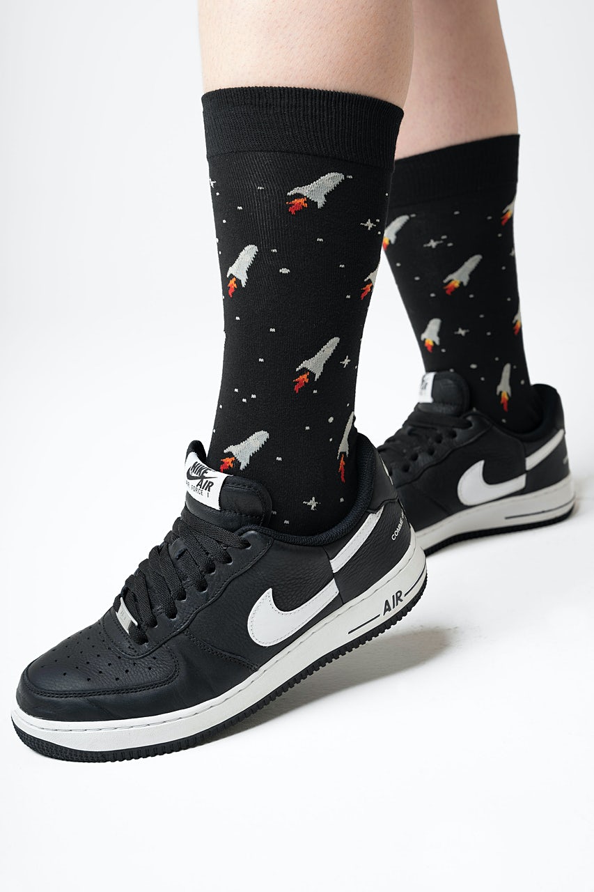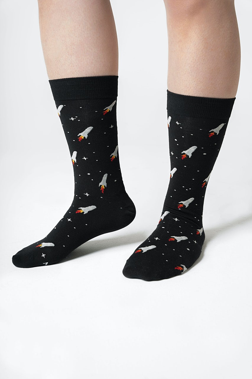 Let your style soar with our Rocket Ship socks. These out-of-this-world socks feature a rocket-filled galaxy, and are made of carded cotton so you can explore the universe with comfort and durability in tow.