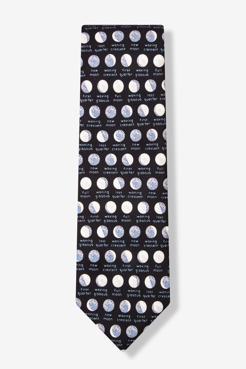 Pass the time with the flow of the moon's phases with Alynn Neckwear's 100% silk It's Just a Phase Tie. The various phases are patterned in sequence to the moon's true orbit with hues of white, grey, and blue on a silk night sky of black.