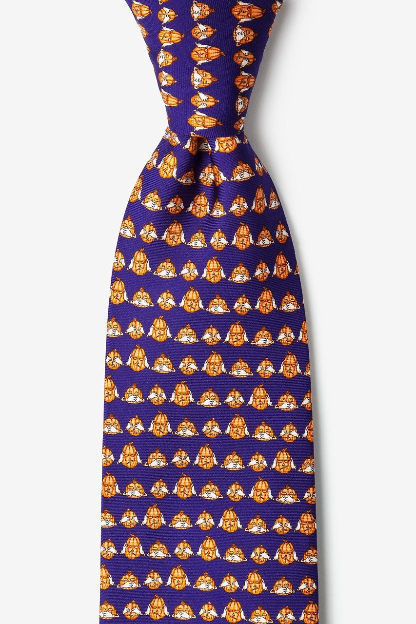 Take a note from these wise Halloween decorations on this Alynn Neckwear See No, Hear No, Speak No Jack necktie. Featuring a line up of orange jack-o-lanterns seen covering their eyes, ears and mouths on a navy blue background. You've been warned!