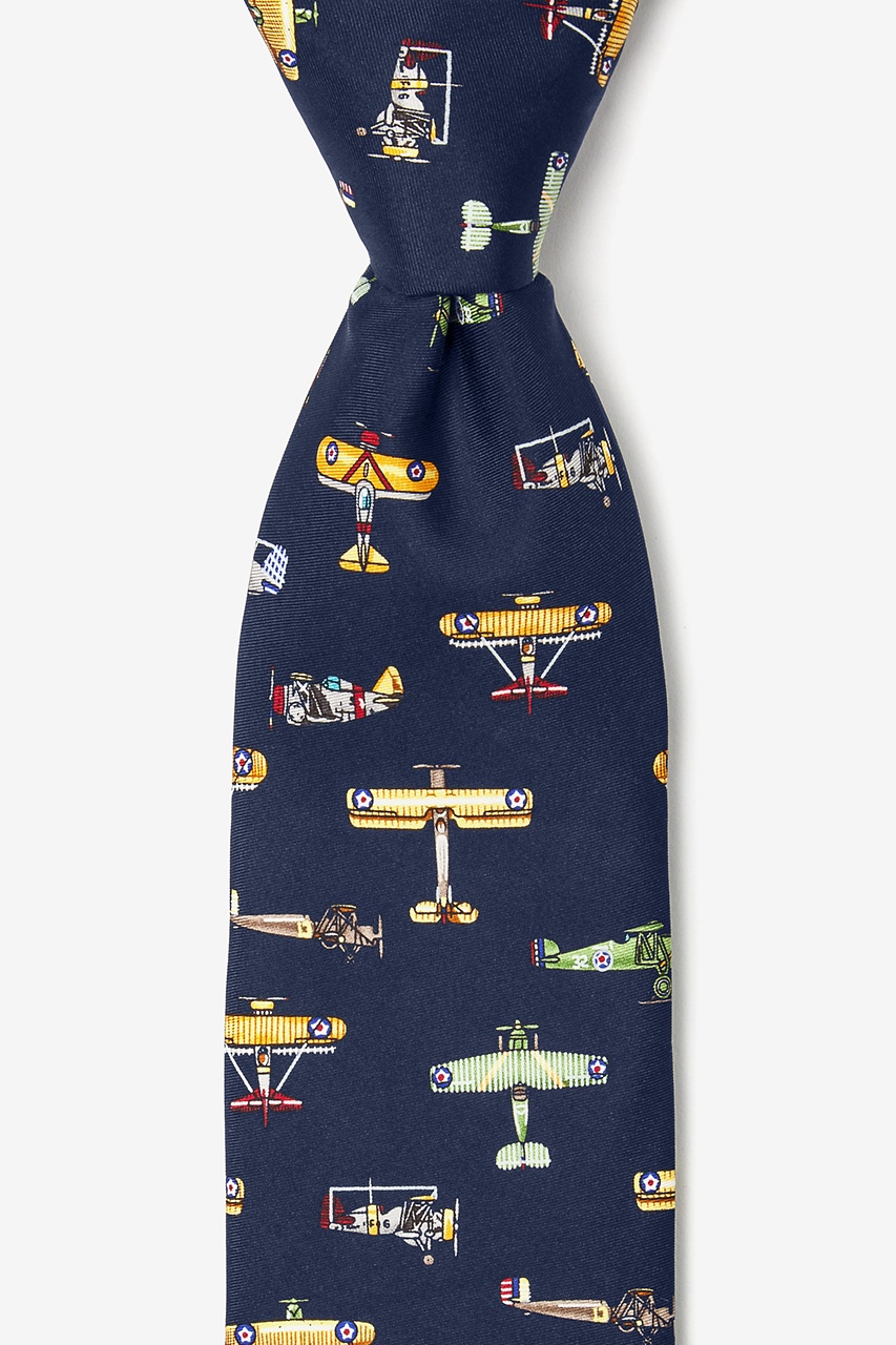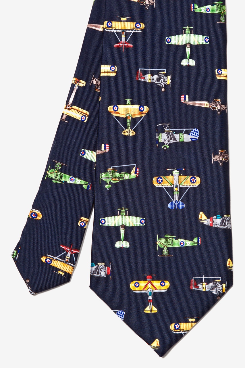 Alynn Neckwear has become famous for producing creative neckwear featuring exclusive design elements. This 100% silk necktie features vintage war planes on a navy blue background.