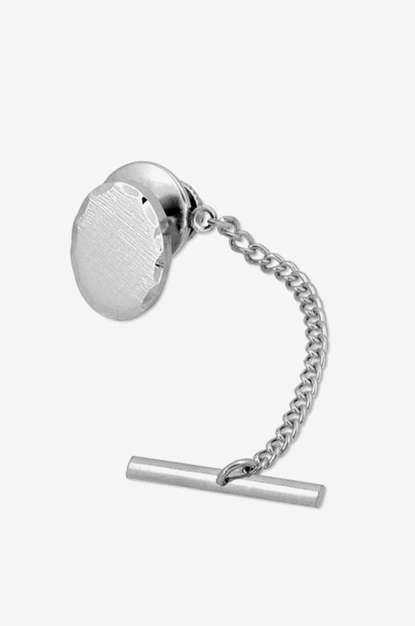 This tie tac features an oval face with a brushed silver finish and cut border. Tac also includes a clutch chain and bar to keep your tie neat and fashionable at all times.