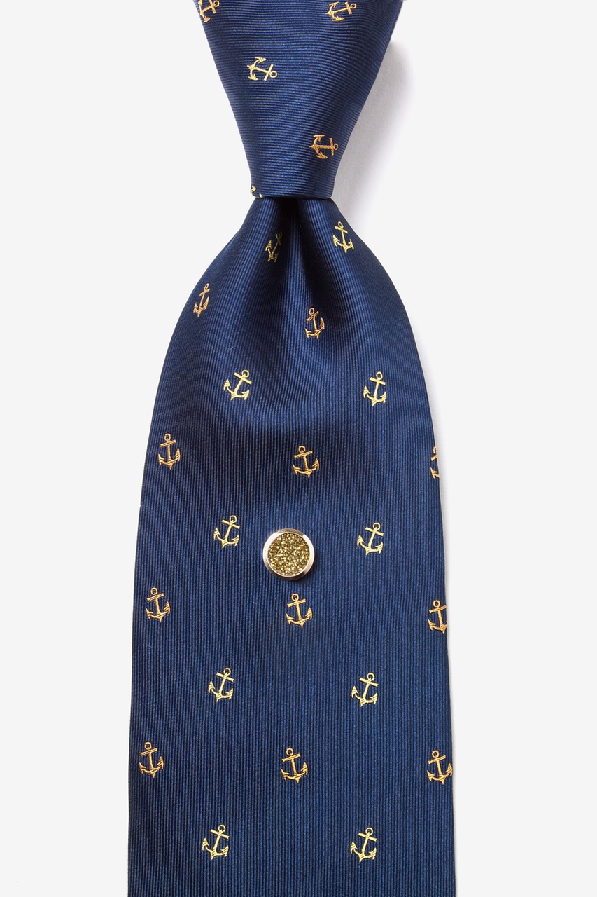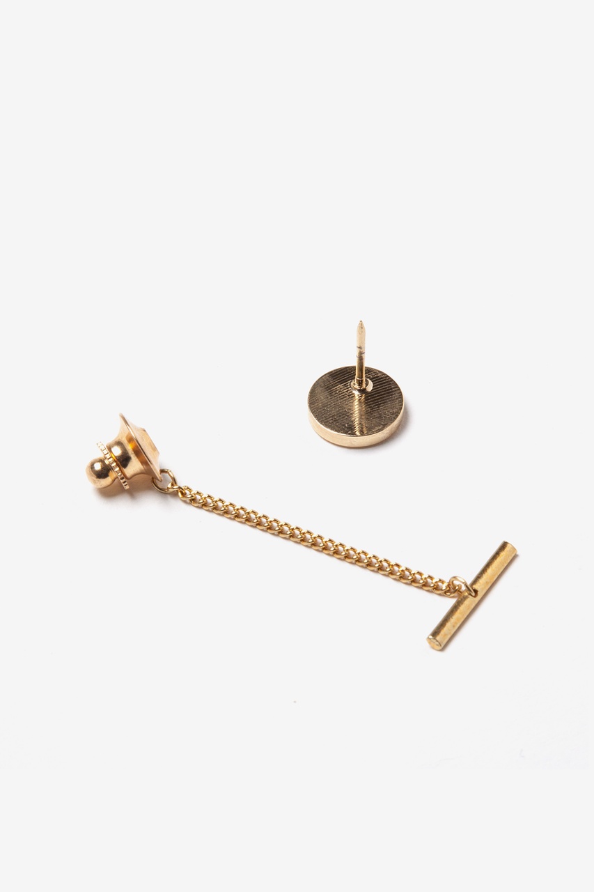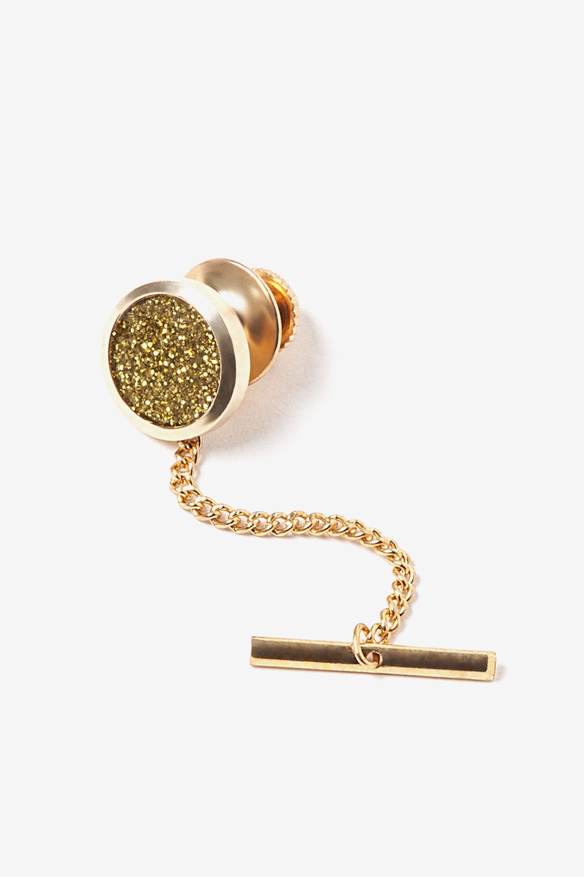 This tie tac has a round setting with an enamel center featuring genuine gold dust flakes. Tac also includes a clutch chain and bar to keep your tie neat and fashionable at all times.