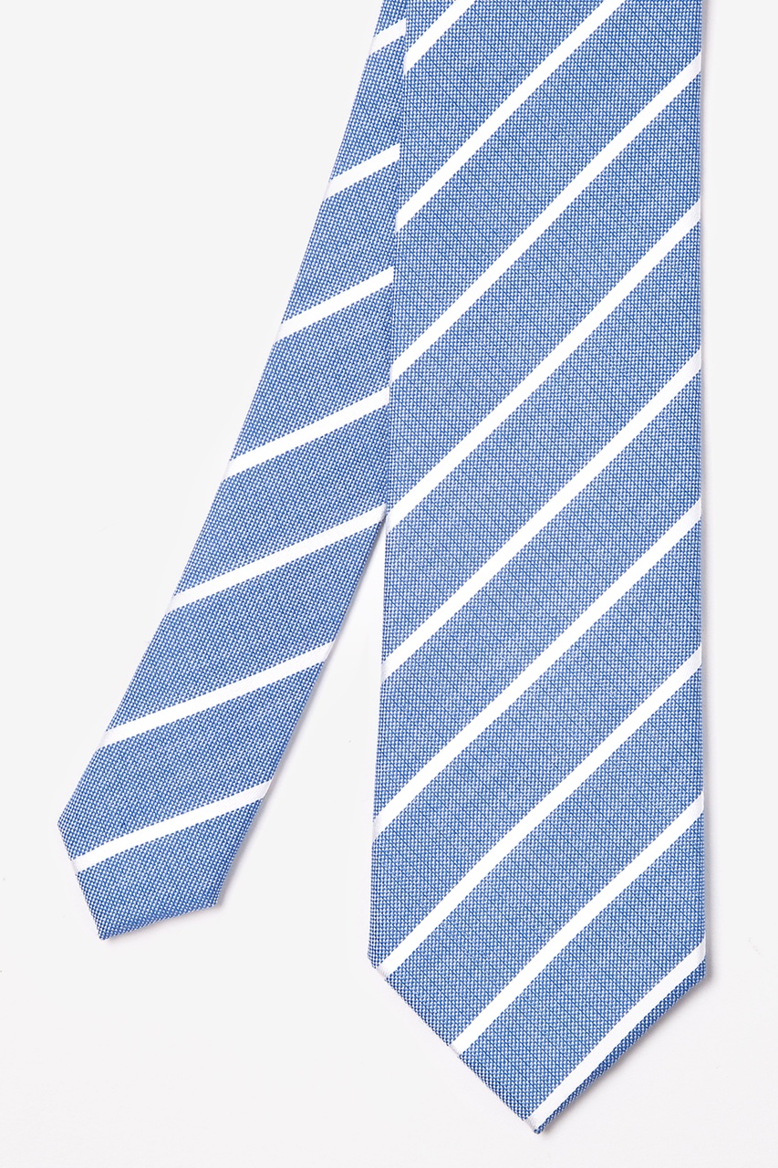 Bold, slim stripes dash across a classic woven skinny tie cut from a fine blend of 59% silk and 41% cotton. This tie features a blue, textured background with white stripes. The texture of the silk and cotton blend reflects natural slubbing.