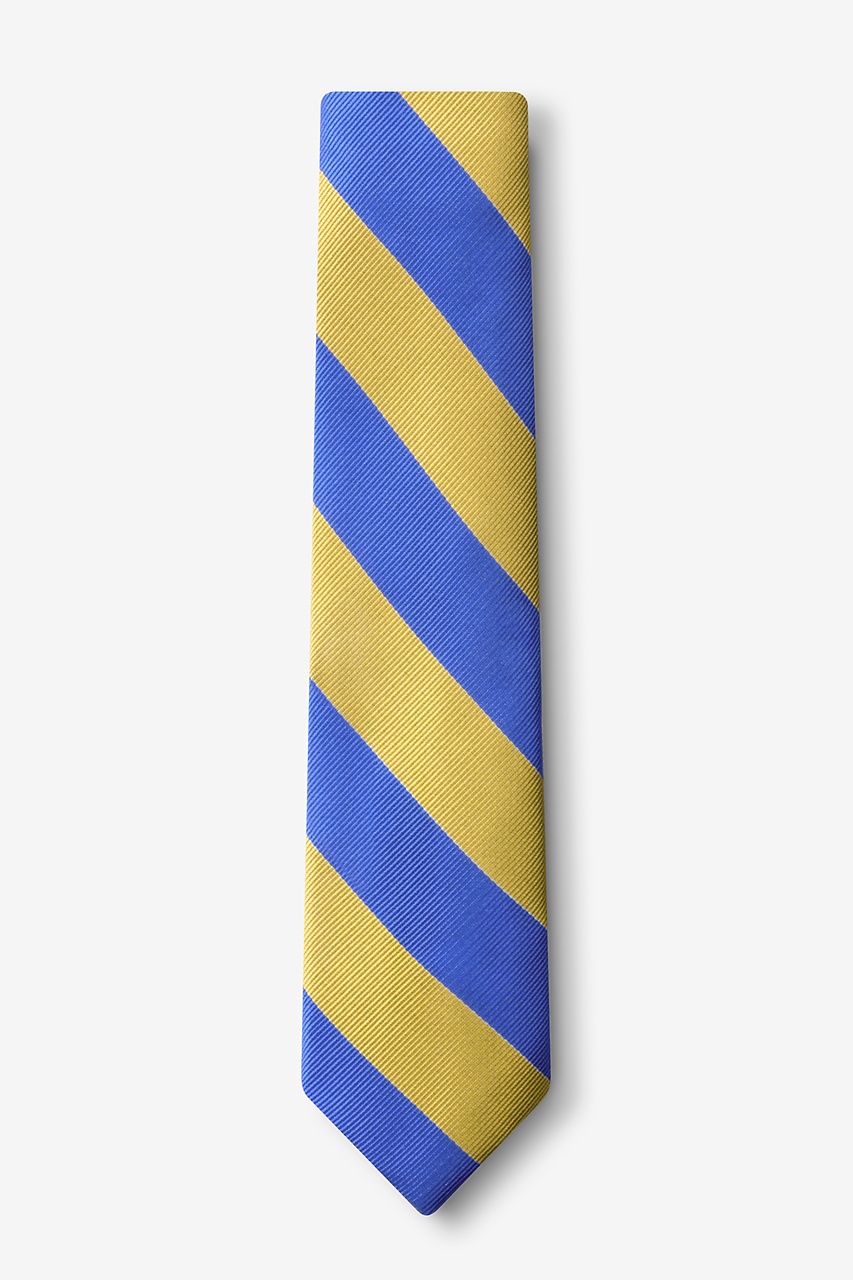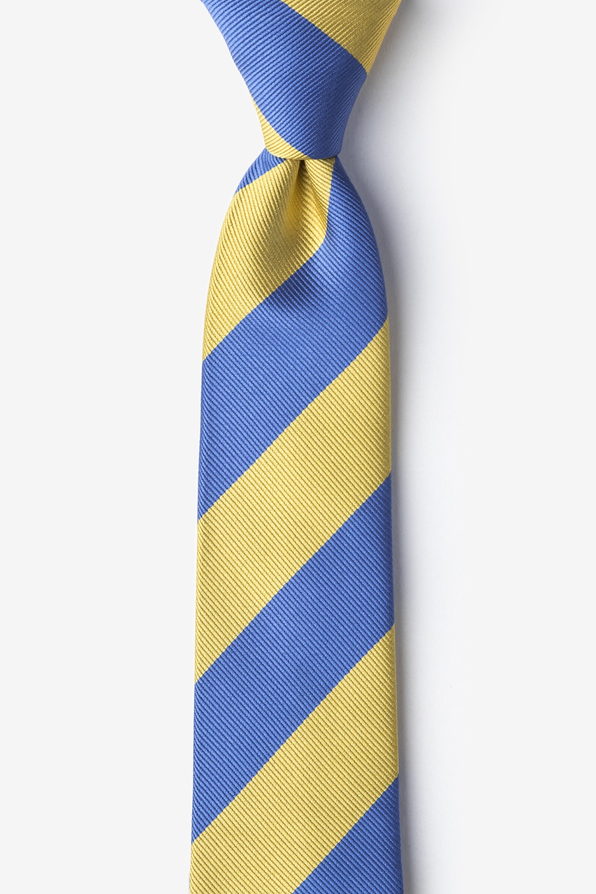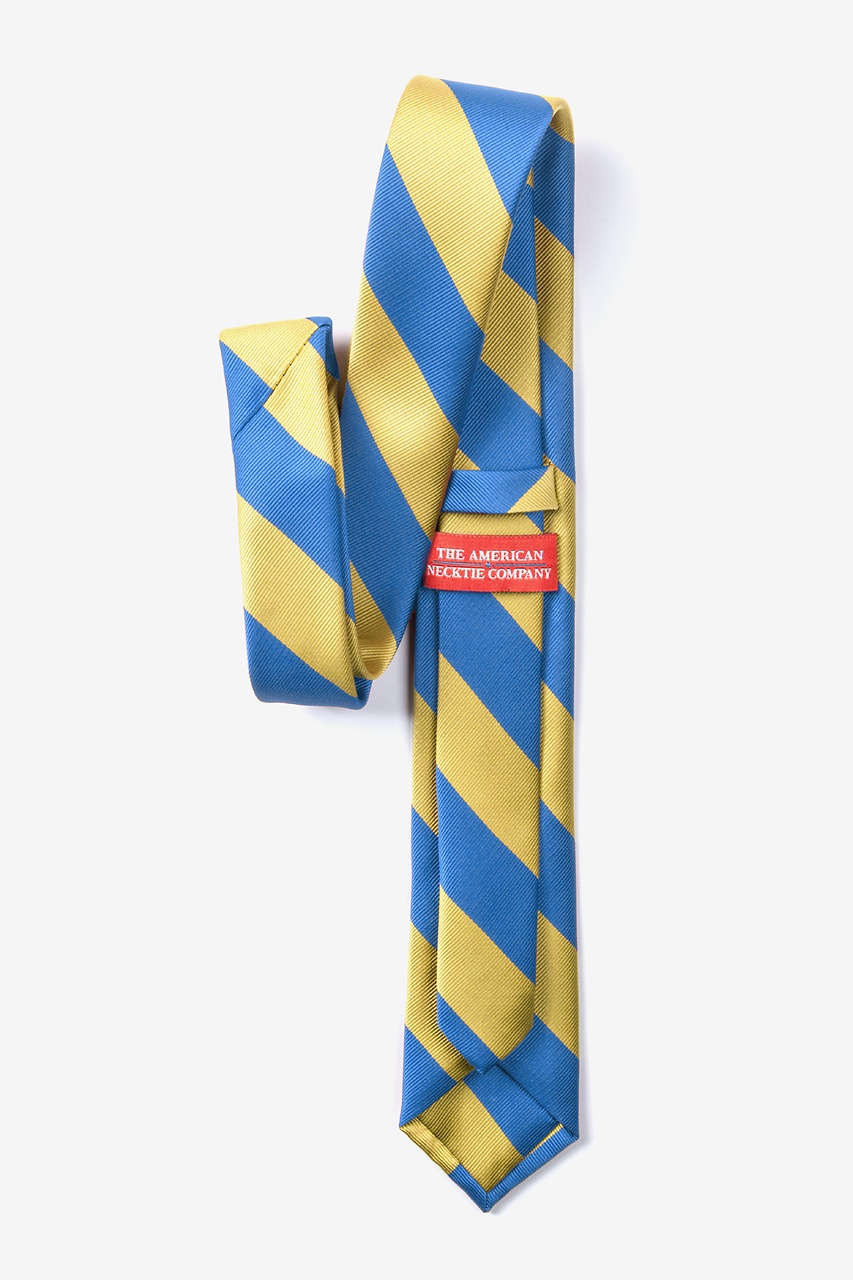 Every distinguished gentleman should own a classic collegiate stripe tie. It's ease of pairing with dress shirts and suits alike has made this design a timeless favorite over the years and a must have for school and business uniforms. Each skinny tie is designed with 100% woven microfibers for a sturdy tie that is sure to outlast the seasons and make for easy maintenance. Featured in blue and gold stripe, we invite you to fall in love with this classic.