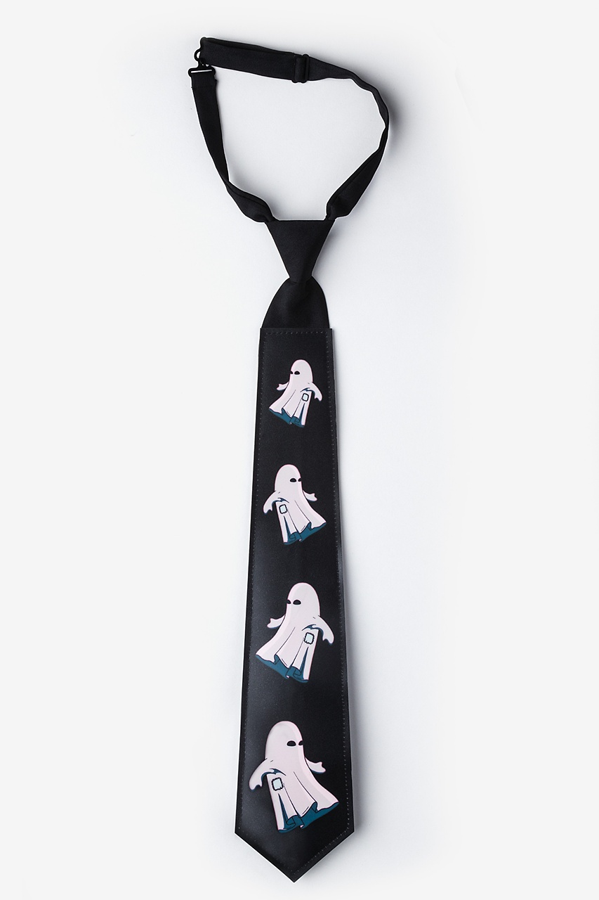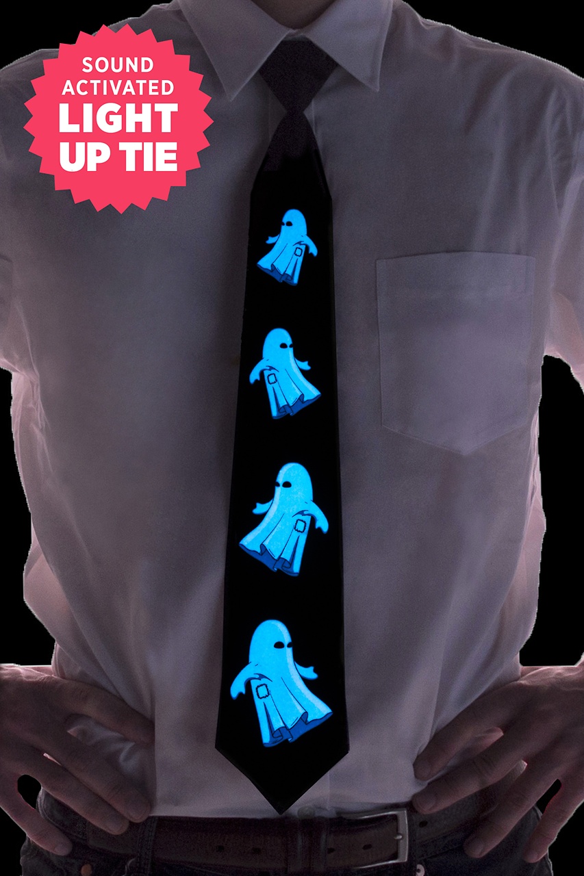 Light up your Halloween with this Ghost Tie. This tie features a built-in light system that flashes along with the beat of the tunes around you. This pre-tied electronic tie is an essential for your next Halloween party or haunted house. 2 AAA batteries not included.
