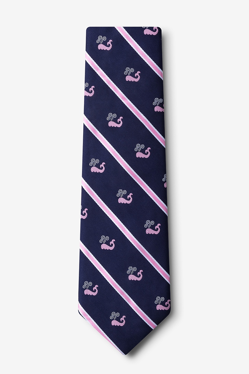 Whale you look at this. This is the type of tie that'll make a splash every time you wear it. It features a repeating pattern of a whale's tail peeking through ocean waves over striped lines.