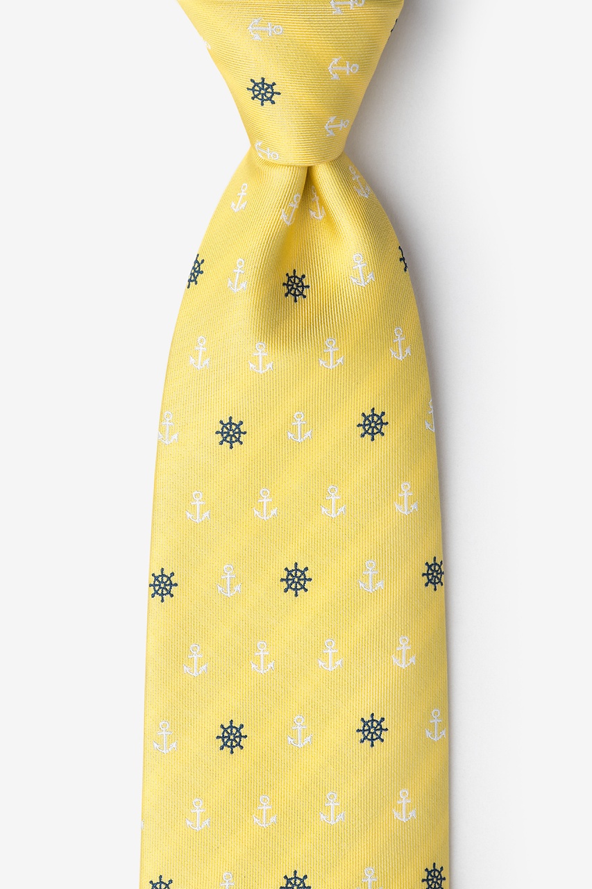 Anchors away! Our Anchors & Ship Wheels Extra Long Tie features a pattern of white anchors and navy blue steering wheels atop a yellow background. Happy sailing!